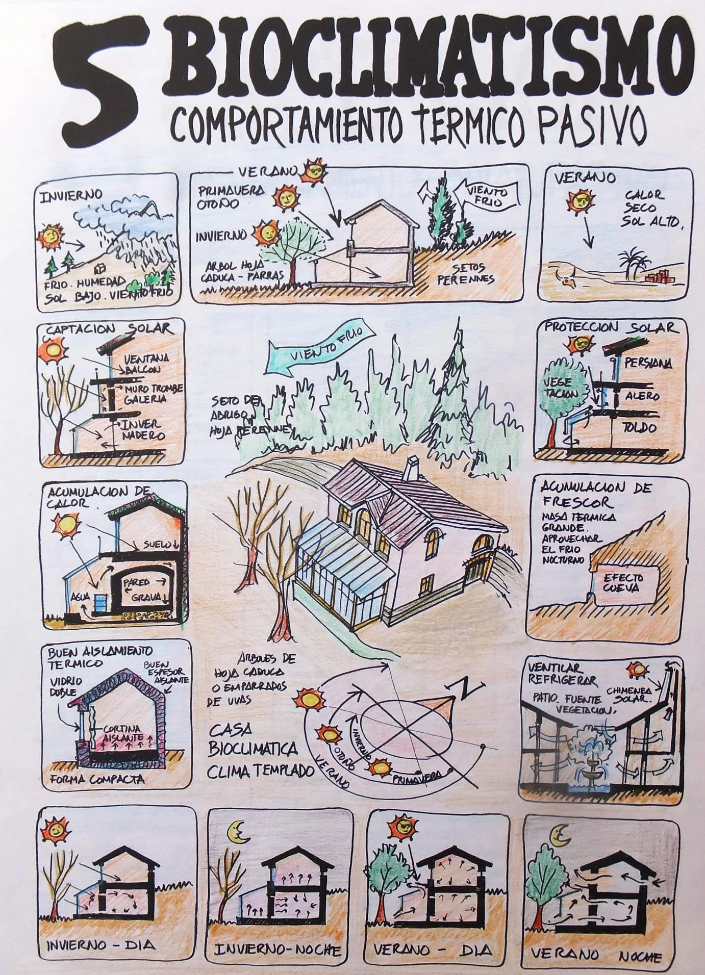 La correcta orientación de un edificio cumple múltiples funciones: permite aprovechar la radiación solar, protegerse del frío y de los vientos dominantes, reducir el consumo energético y mejorar el confort térmico y lumínico sin añadir costes adicionales. A través de la arquitectura bioclimática se puede lograr un ahorro significativo en calefacción y refrigeración, utilizando las condiciones ambientales del entorno como aliadas. Esta forma de proyectar no es nueva: ha estado presente desde los orígenes de la arquitectura, aunque quizá se ha ido olvidando con el tiempo. Es, en realidad, la forma más sencilla e inteligente de construir, teniendo en cuenta la temperatura media de cada estación, la insolación, la dirección del viento, la vegetación del lugar.