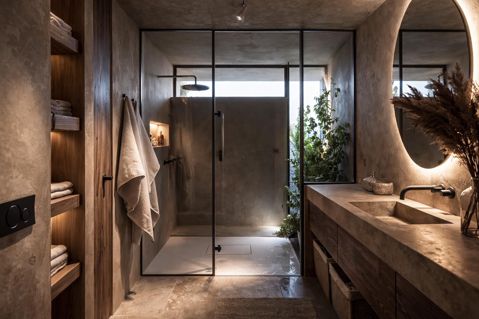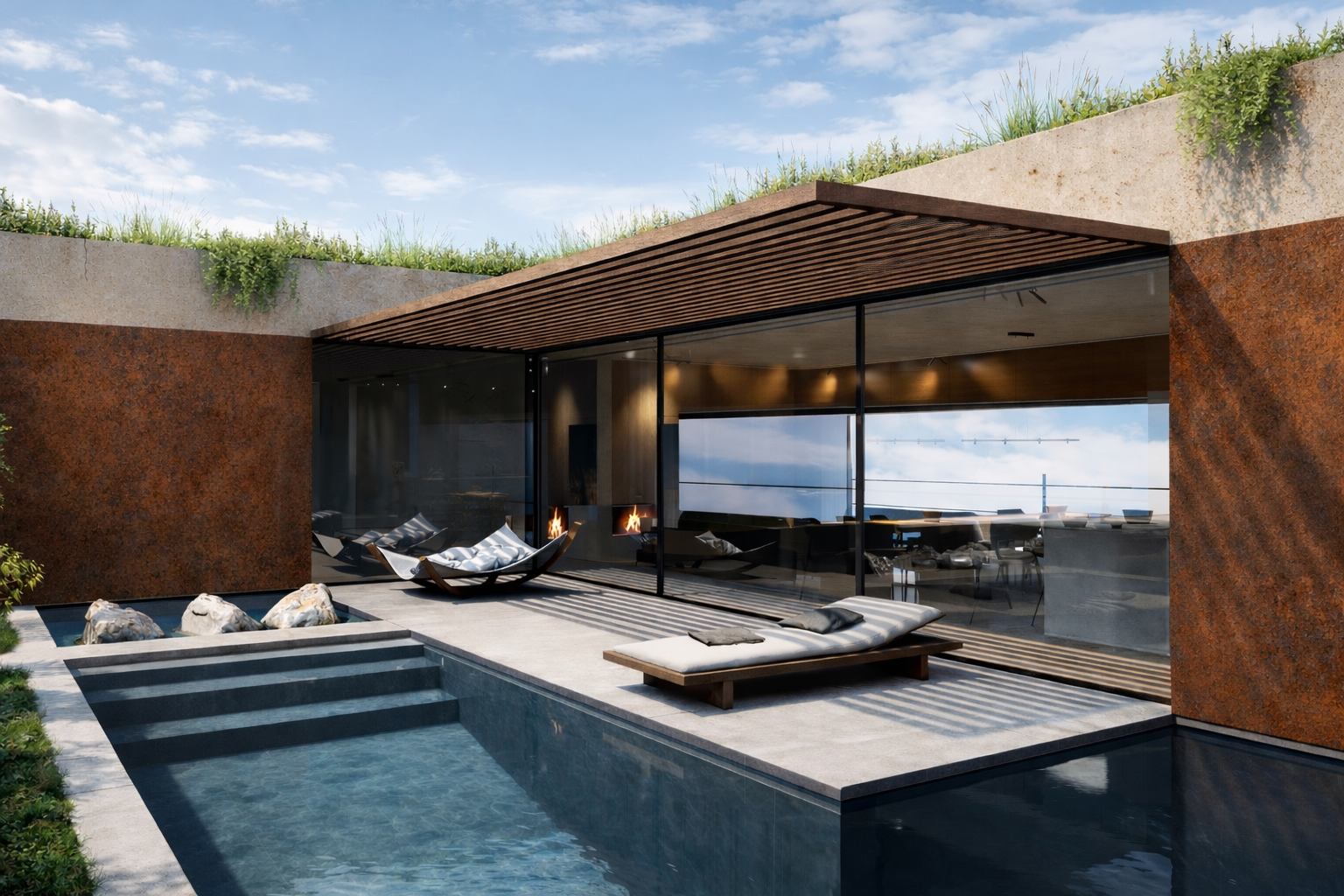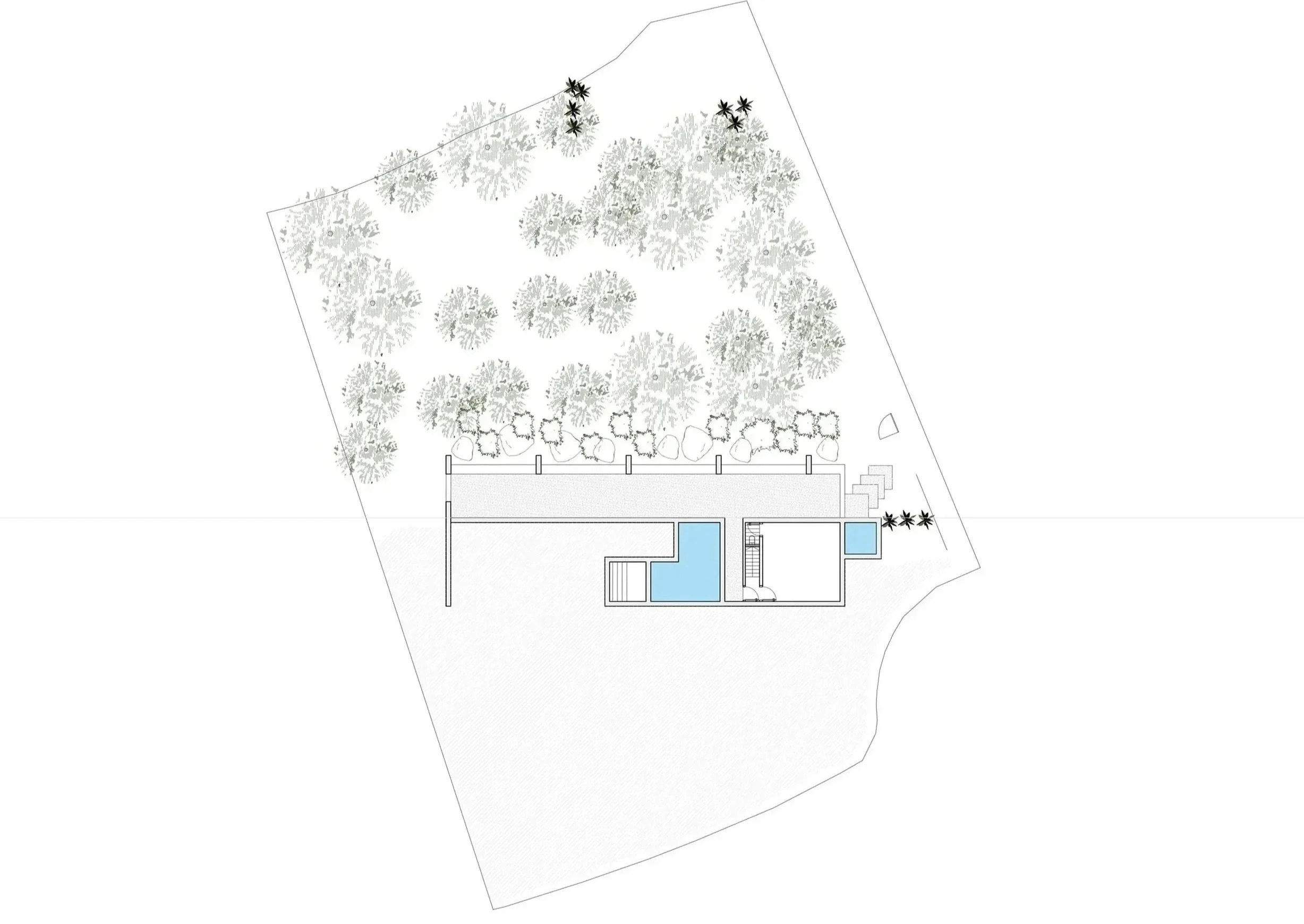 Ubicada en una parcela con pendiente y un paisaje natural marcado, la casa se integra con discreción en su entorno gracias a una implantación cuidadosa y a un lenguaje arquitectónico sobrio, de inspiración minimalista y brutalista.