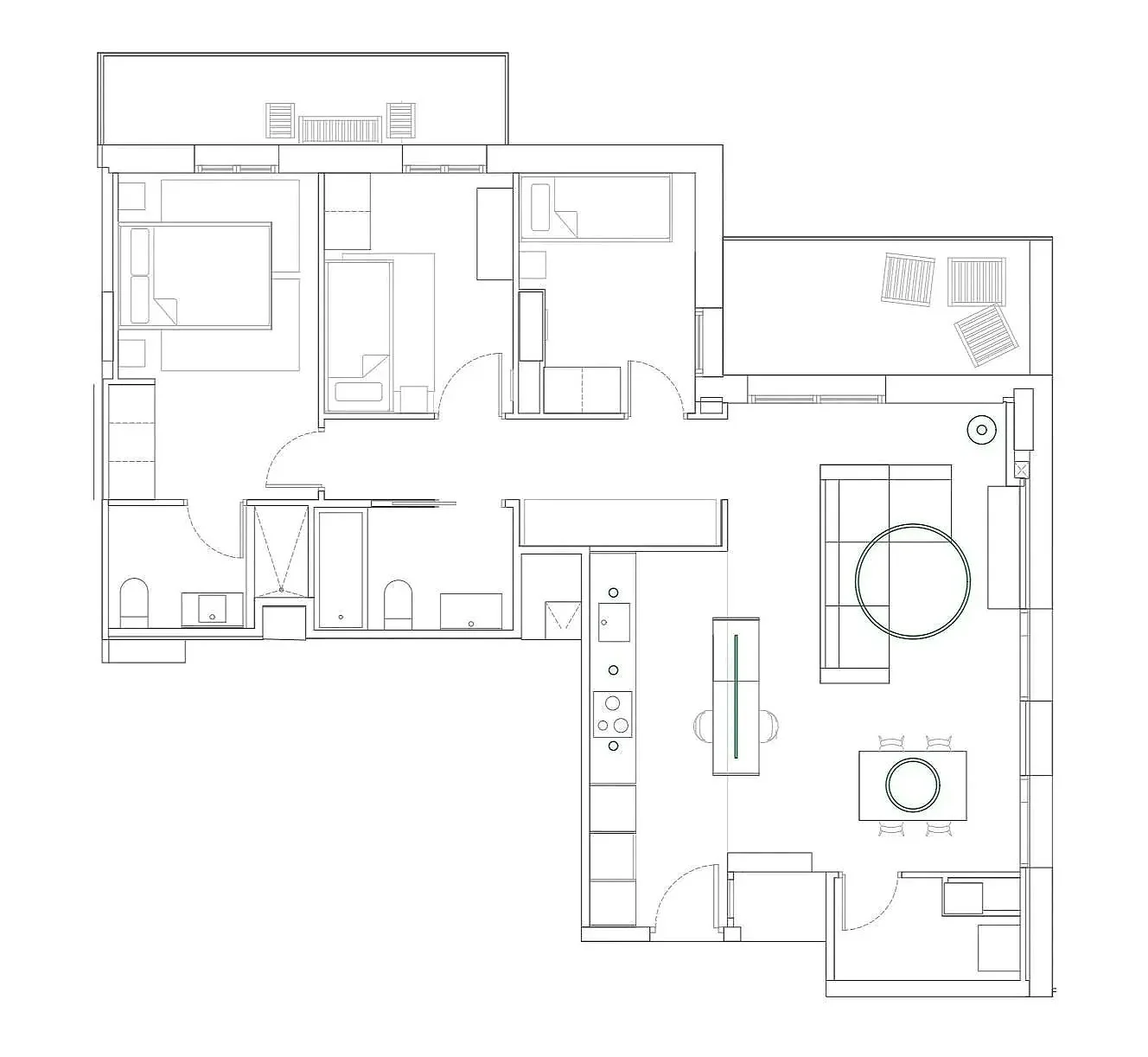 La iluminación tuvo un papel fundamental. Se trabajó con diferentes tipologías de luminarias para generar ambientes confortables y luminosos: desde los downlights en los dormitorios hasta los focos de techo en la sala de estar, pasando por luminarias con más presencia, como la sobremesa de la cocina o las lámparas circulares situadas sobre la mesa de comedor y la zona del sofá. Esta combinación aporta calidez, carácter y equilibrio a cada espacio.