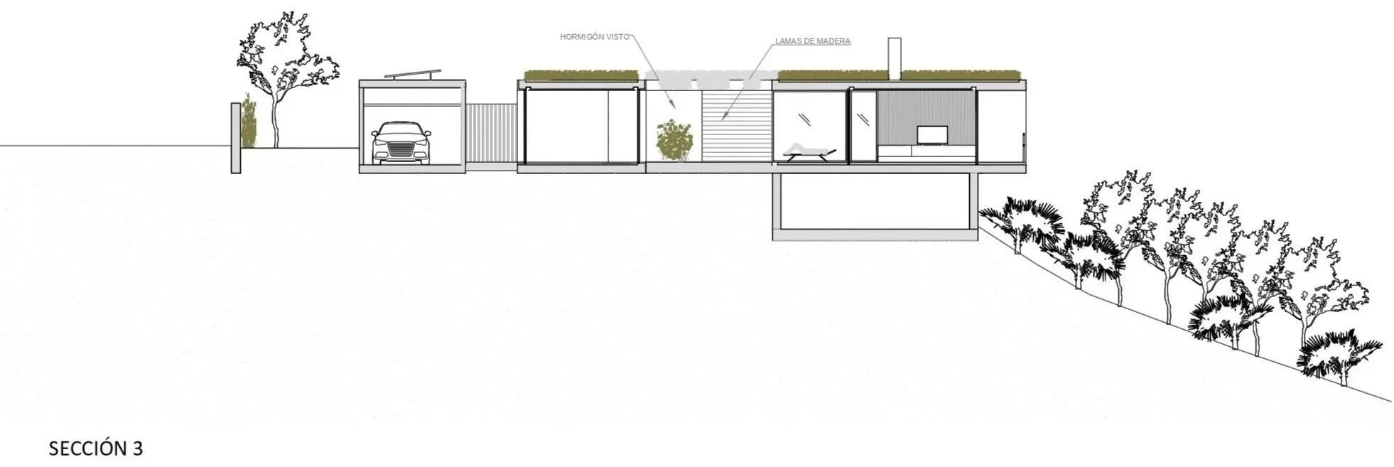 Ubicada en una parcela con pendiente y un paisaje natural marcado, la casa se integra con discreción en su entorno gracias a una implantación cuidadosa y a un lenguaje arquitectónico sobrio, de inspiración minimalista y brutalista. Disponiendo de tres volúmenes principales, que son el patio interior, la vivienda y el taller, el proyecto permite la entrada de luz natural y ventilación a los espacios interiores, unidos por un patio abierto, a la vez que cumple el requisito del cliente de crear una casa aislada y protegida hacia el exterior.